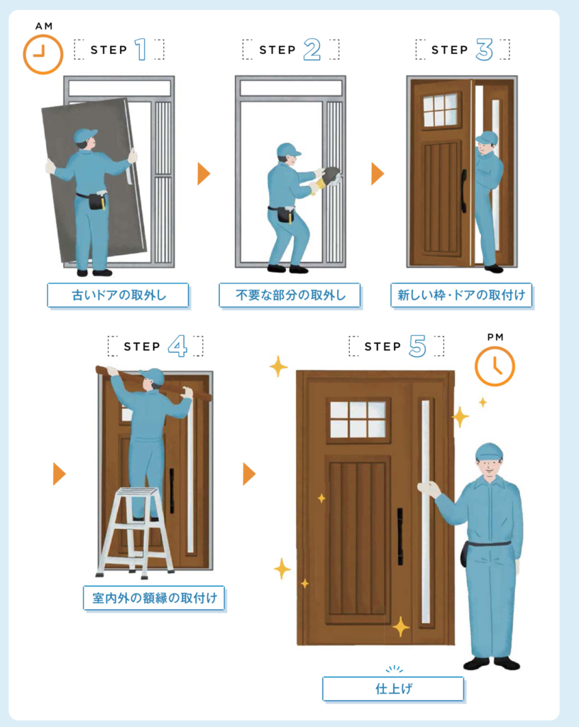 ドアリモは既存の枠を活かす施工方法のため、工事は1日で完了します。