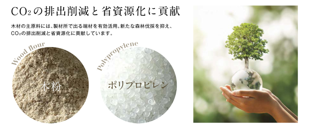 YKKapでは木粉と高硬度なポリプロピレンを配合した再生木で天然木の様な温もりが魅力の物もあります。